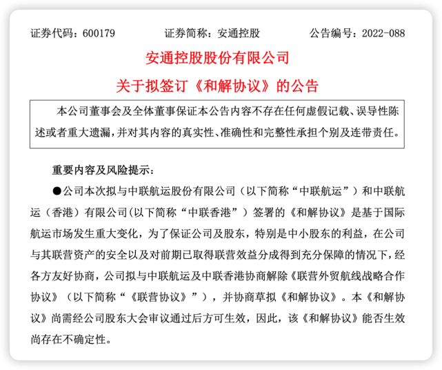 两家公司经过两三个月的协商,决定友好终止合作,安通控股的12艘集装箱船相应退出。8日下午安通公告双方已友好达成和解协议,中联航运拟付出和解金4.7亿人民币,本协议尚需经股东会同意方可生效。