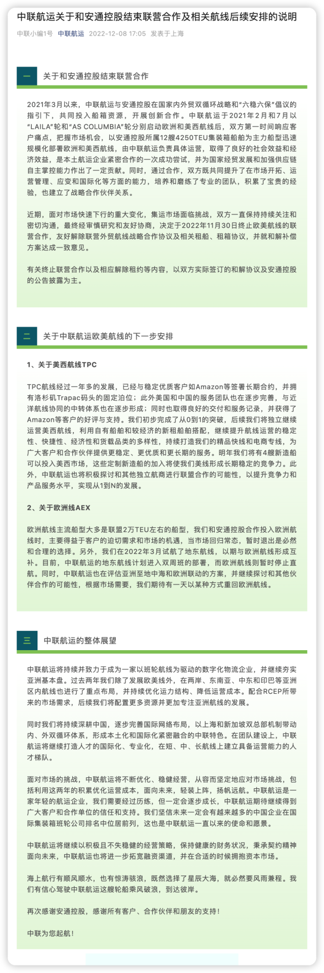 中联航运和安通控股是联营合作经营欧美线,不是简单的租船关系。安通控股在公开与中联航运的解除合作通知中写道:“双方前期合作取得良好效益,现因国际形势巨变,导致与之息息相关的国际航运市场一路急转直下呈雪崩式暴跌,面对如此重大危机,经中联航运及中联香港实际测算,联营欧美航线已经难以维持正常经营,必须及时加以调整、尽快采取止损措施”。